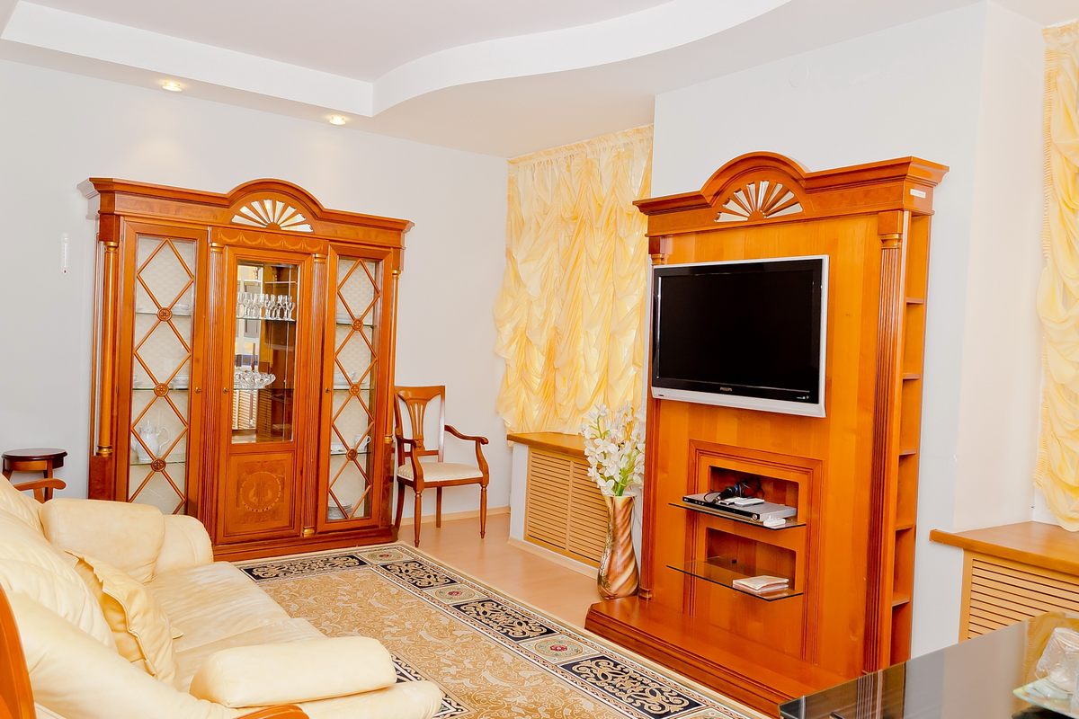 В номере: Гостинная: телефон, телевизор, DVD-проигрыватель, диван-кровать, стенка-горка. Спальная: двуспальная кровать, комод, столик прикроватный, телевизор. Гостинная-столовая: холодильник, телевизор, кухонный гарнитур, микроволновая печь, электрический чайник.