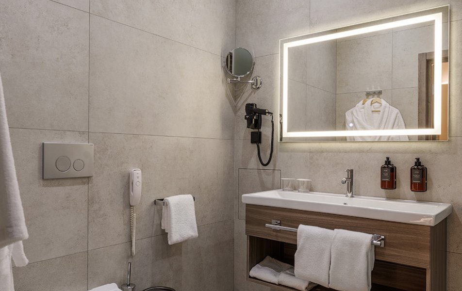 В номере: вешалка, диван, зеркало, кресло, кровать двуспальная, прикроватные тумбочки, стол, шкаф, мини-холодильник, сейф, телевизор ЖК, телефон, чайный набор посуды, электрочайник