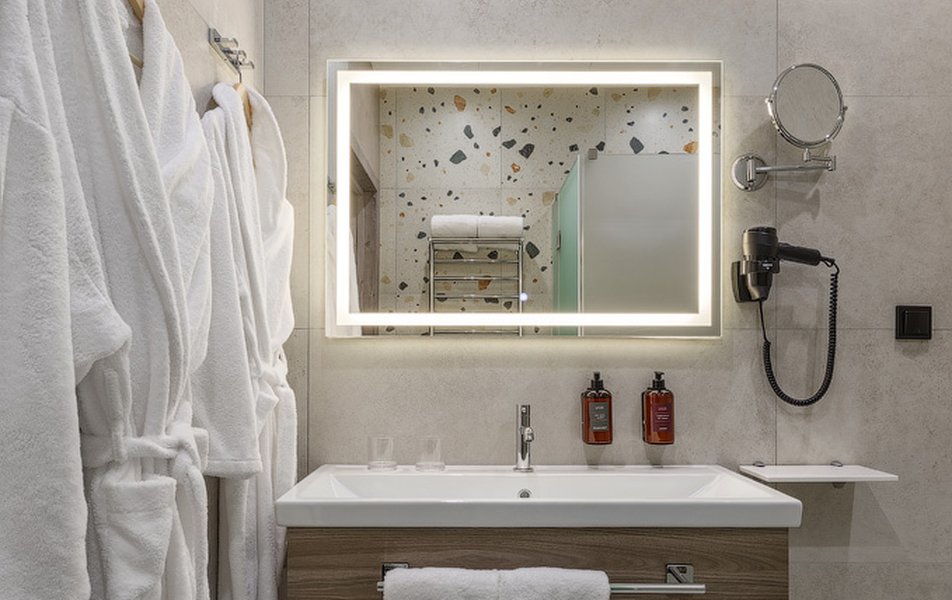 В номере: вешалка, зеркало, кровать двуспальная, прикроватная тумбочка, стол, тумба багажная, шкаф, мини-холодильник, сейф, телевизор ЖК, телефон, чайный набор посуды, электрочайник
