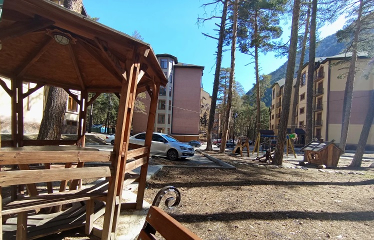 Четырехэтажный корпус отеля утопает в зелени хвойного леса и окружен величественными горными вершинами. В отеле представлено 35 комфортабельных номеров различных категорий, включая как уютные комнаты на цокольном этаже, так и роскошные двухуровневые апартаменты. Каждый номер оборудован отдельным санузлом и мини-кухней, оснащенной всей необходимой техникой, включая электрическую плиту. Для комфортного пребывания гостей в каждом номере установлены сплит-системы или кондиционеры.