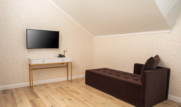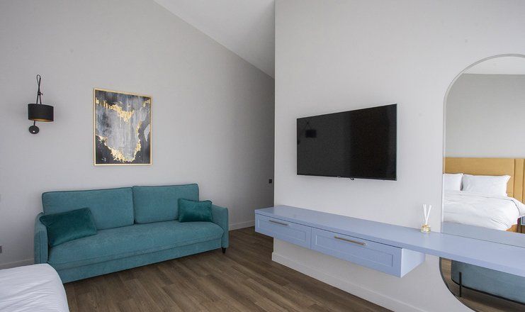 В номере: кровати двуспальные, кухонная мебель, набор мягкой мебели, прикроватные тумбочки, стол, столик журнальный, стулья, шкаф, гладильная доска, кондиционер, микроволновая печь, набор посуды, сейф, сплит-система, телевизор ЖК: 3, телефон, утюг, холодильник, чайная станция и бутилированная вода
