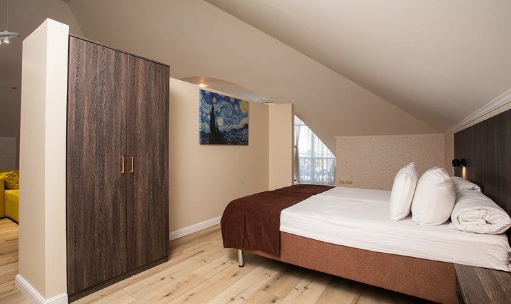 В номере: кровати двуспальные, кухонная мебель, набор мягкой мебели, прикроватные тумбочки, стол, столик журнальный, стулья, шкаф, гладильная доска, кондиционер, микроволновая печь, набор посуды, сейф, сплит-система, телевизор ЖК: 3, телефон, утюг, холодильник чайная станция и бутилированная вода