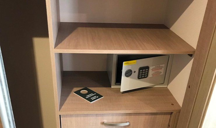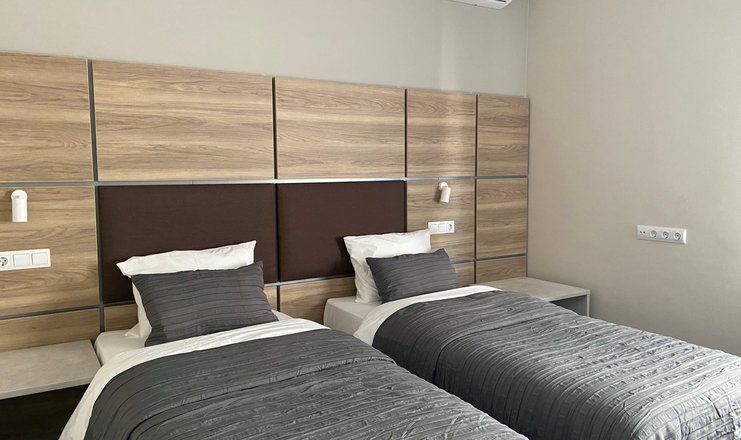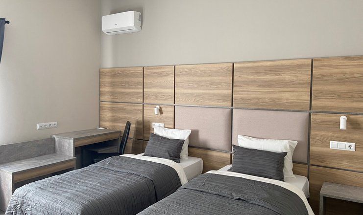 В номере: кровати односпальные, прикроватные тумбочки, стол, стулья, кресло, шкаф, сейф, сплит-система, телевизор, телефон, чайная посуда