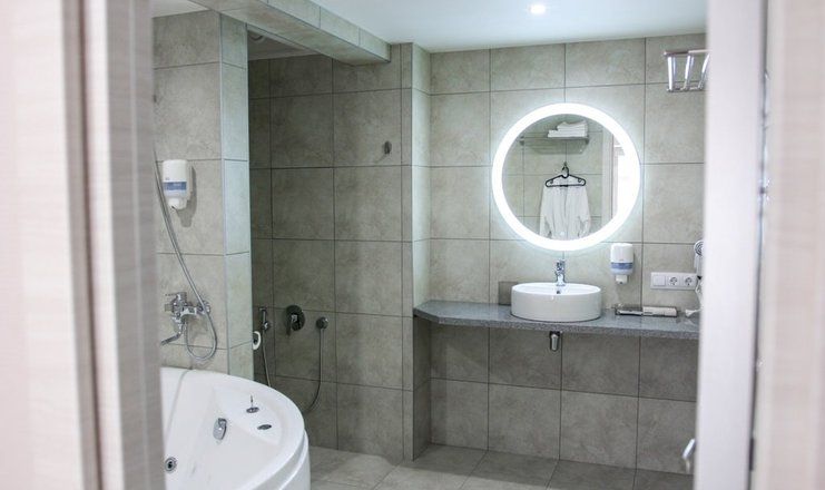 Санузел: ванна-джакузи, раковина, унитаз, биде, фен, гигиенические принадлежности, тапочки