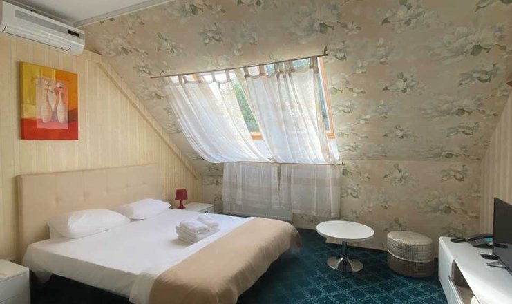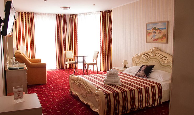 В номере: кровать двуспальная, прикроватные тумбочки, стол, стулья, шкаф, кондиционер, мини-холодильник, сейф, телевизор ЖК