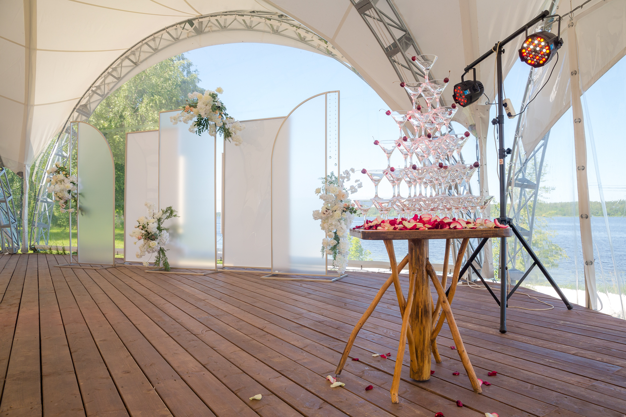 Белоснежный шатер стабилизировался в уединенной зеленой зоне с видом на Волгу.