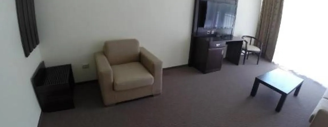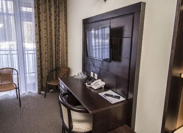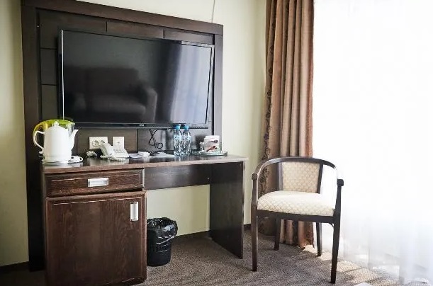 В номере: кровать «King-size», два телевизора, светильник, электронные замки, кондиционер, Wi-Fi, телефон, зеркало, кресло, тумбы, стулья, диван, вешалки, чайник, чайный набор, шкаф-купе