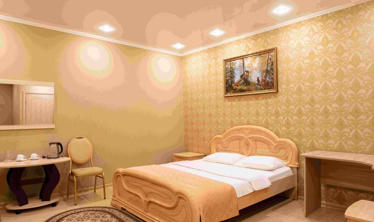 В номере: вешалка, зеркало, кровать двуспальная, прикроватные тумбочки, стол, стулья, шкаф, гладильная доска, телевизор, холодильник, чайник